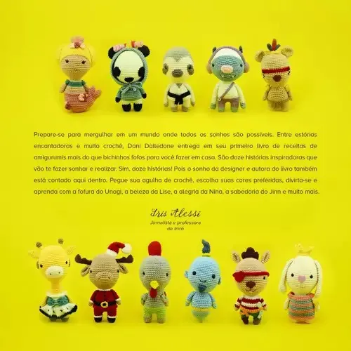 "Prepare-se para mergulhar em um mundo onde todos os sonhos são possíveis. Entre estórias encantadoras e muito crochê, Dani Dalledone entrega em seu primeiro livro de receitas de amigurumis mais do que bichinhos fofos para você fazer em casa. São doze histórias inspiradoras que vão te fazer sonhar e realizar. Sim, doze histórias! Pois o sonho da designer e autora do livro também está contado aqui dentro. Pegue sua agulha de crochê, escolha suas cores preferidas, divirta-se e aprenda com a fofura do Unagi, a beleza da Lise, a alegria da Bibe, a sabedoria do Jinn e muito mais."